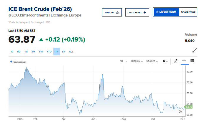 وارتفعت عقود خام برنت الآجلة بنحو 0.1%، لتسجّل 63.87 دولاراً للبرميل، فيما صعد خام غرب تكساس الوسيط الأميركي بنحو 0.2%، إلى 60.21 دولاراً للبرميل.