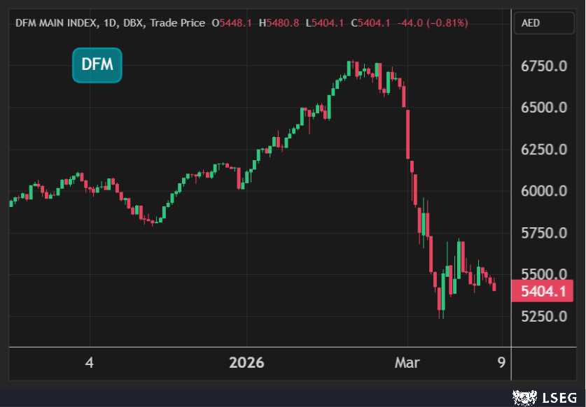 وفي سوق دبي، تراجع المؤشر العام بنسبة 0.8% في جلسة الثلاثاء مسجلاً رابع خسارة يومية على التوالي متأثراً بانخفاض القيادي سهم إعمار العقارية بنحو 4%.