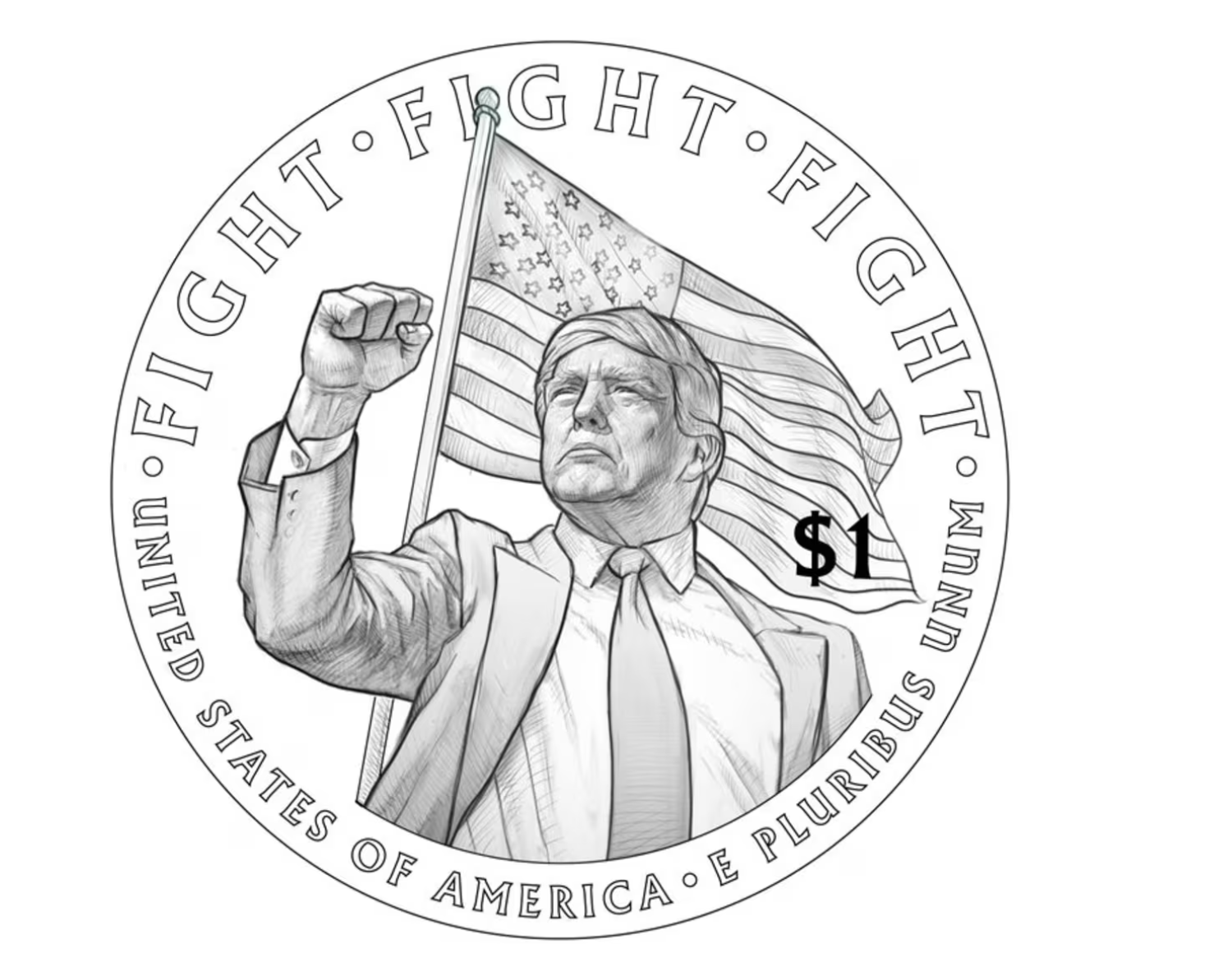 المسودة الأولية لعملة الدولار التذكارية تُظهر على وجهها الأمامي صورة الرئيس دونالد ترامب تتوسطها كلمة «الحرية» في الأعلى وشعار «بالله نثق» أسفل الصورة، إلى جانب التاريخين 1776 و2026، بينما يحمل الوجه الخلفي مشهدًا لترامب وهو يرفع قبضته بعد محاولة اغتياله في ولاية بنسلفانيا، تعلوه عبارة «حارب، حارب، حارب» وخلفه علم الولايات المتحدة يرفرف.
